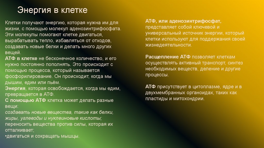 Энергия в клеткеКлетки получают энергию, которая нужна им для