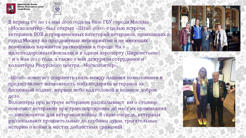 В период с 6 по 14 мая 2016 года на базе ГБУ города Москвы«Мосволонтёр» был открыт «Штаб 2016» с целью встречи