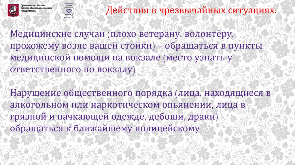 Действия в чрезвычайных ситуациях:Медицинские случаи (плохо ветерану, волонтёру,