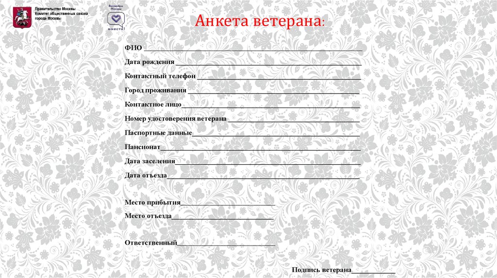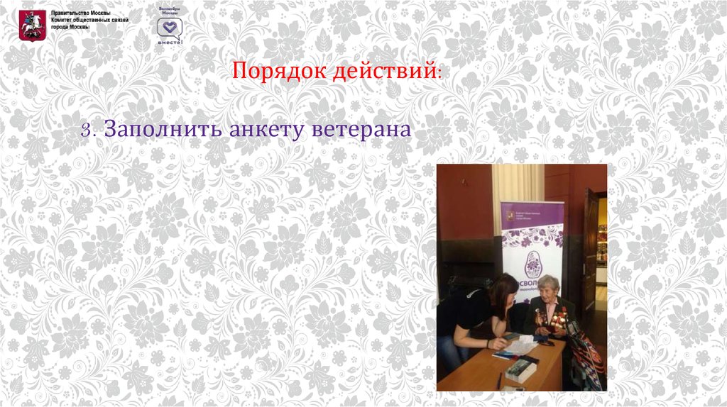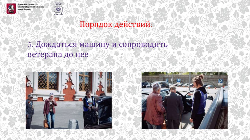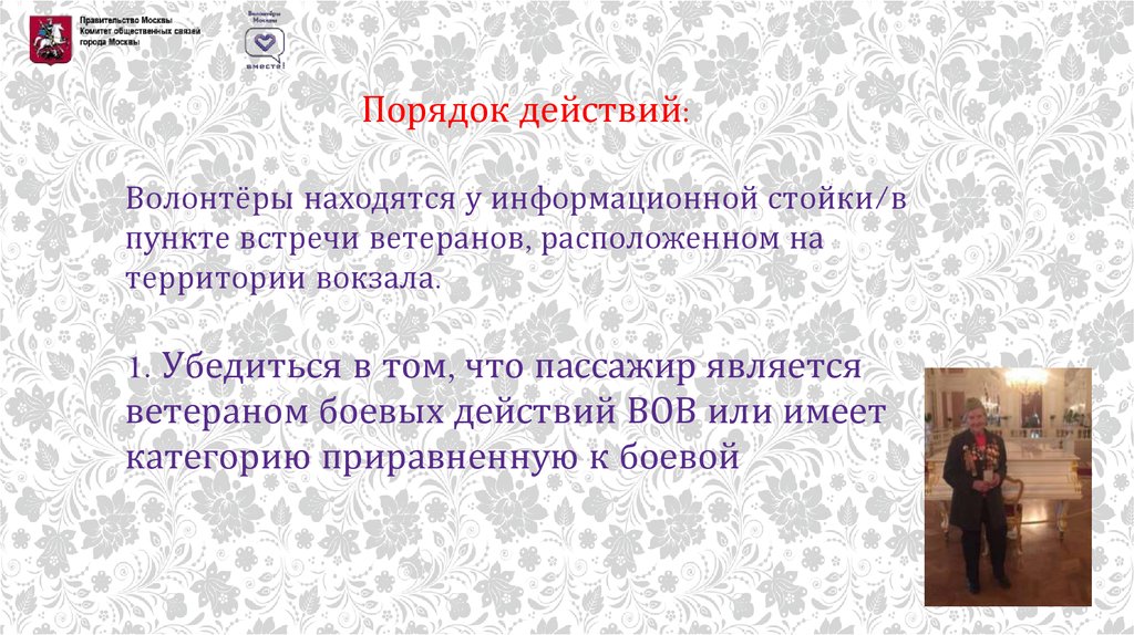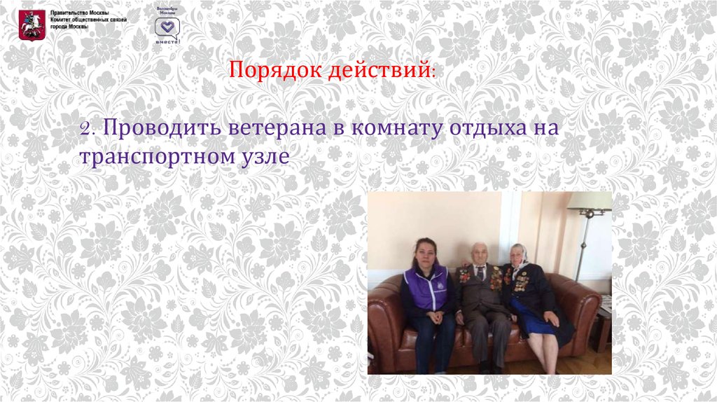 Порядок действий:2. Проводить ветерана в комнату отдыха на