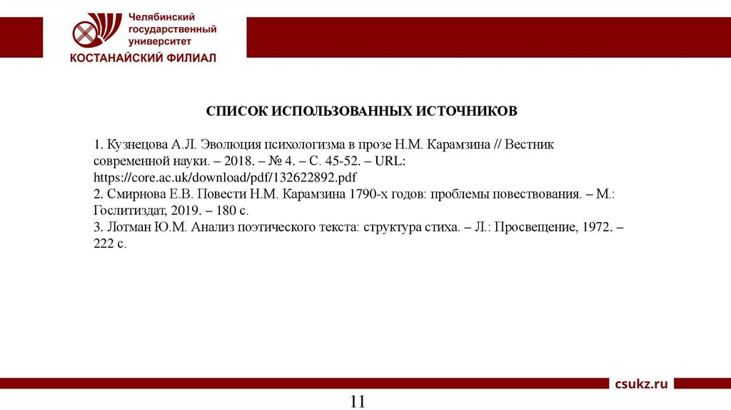 СПИСОК ИСПОЛЬЗОВАННЫХ ИСТОЧНИКОВ1. Кузнецова А.Л. Эволюция психологизма в прозе Н.М. Карамзина // Вестник