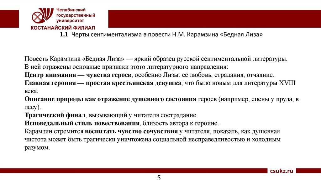 также проанализировал, как эти черты проявляются в таких произведениях, как «Бедная Лиза» Карамзина и