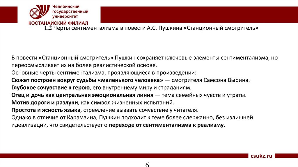 1.2 Черты сентиментализма в повести А.С. Пушкина «Станционный смотритель»В повести «Станционный смотритель» Пушкин сохраняет ключевые элементы сентиментализма, но