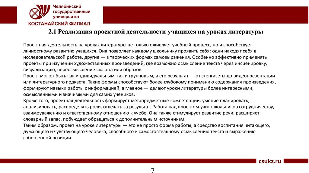 2.1 Реализация проектной деятельности учащихся на уроках литературыПроектная деятельность на уроках литературы не только оживляет учебный процесс, но и способствует