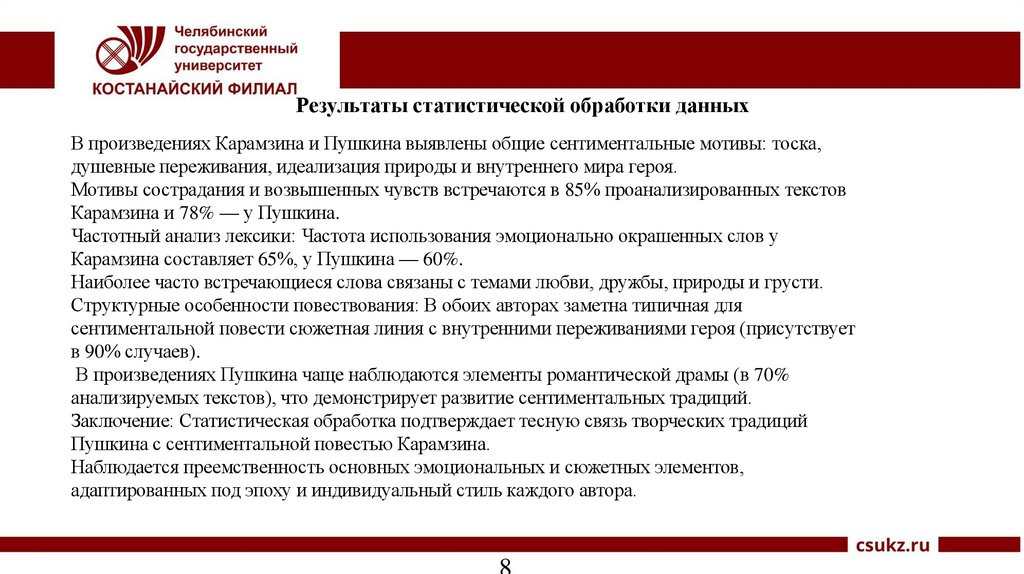 Результаты статистической обработки данныхВ произведениях Карамзина и Пушкина выявлены общие сентиментальные мотивы: тоска,