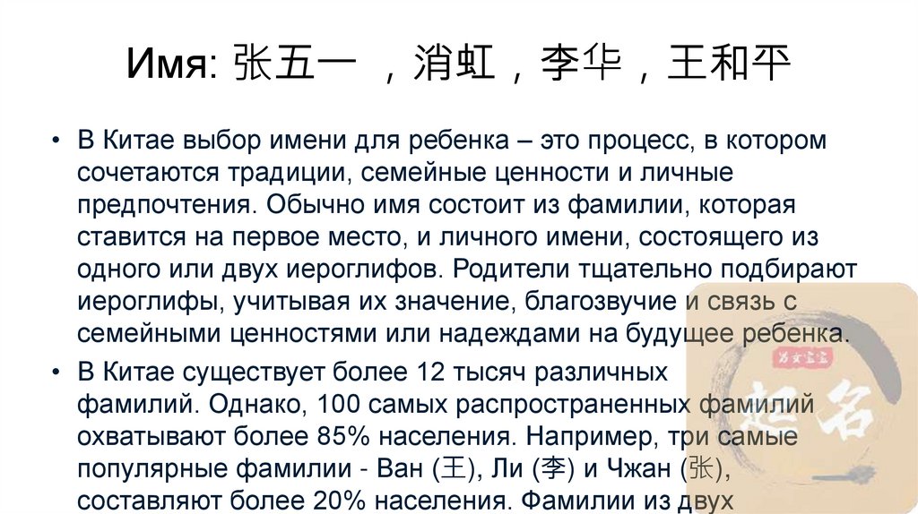 Имя: 张五一 消虹 李华 王和平• В Китае выбор имени для ребенка – это процесс, в котором