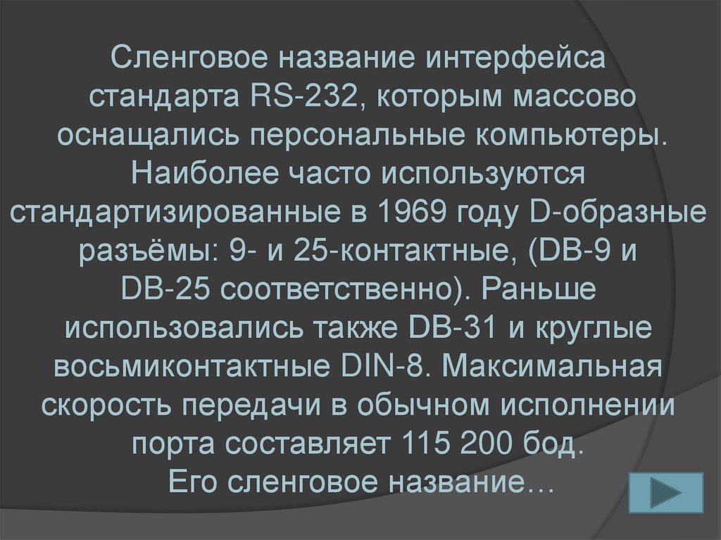 Сленговое название интерфейсастандарта RS-232, которым массово