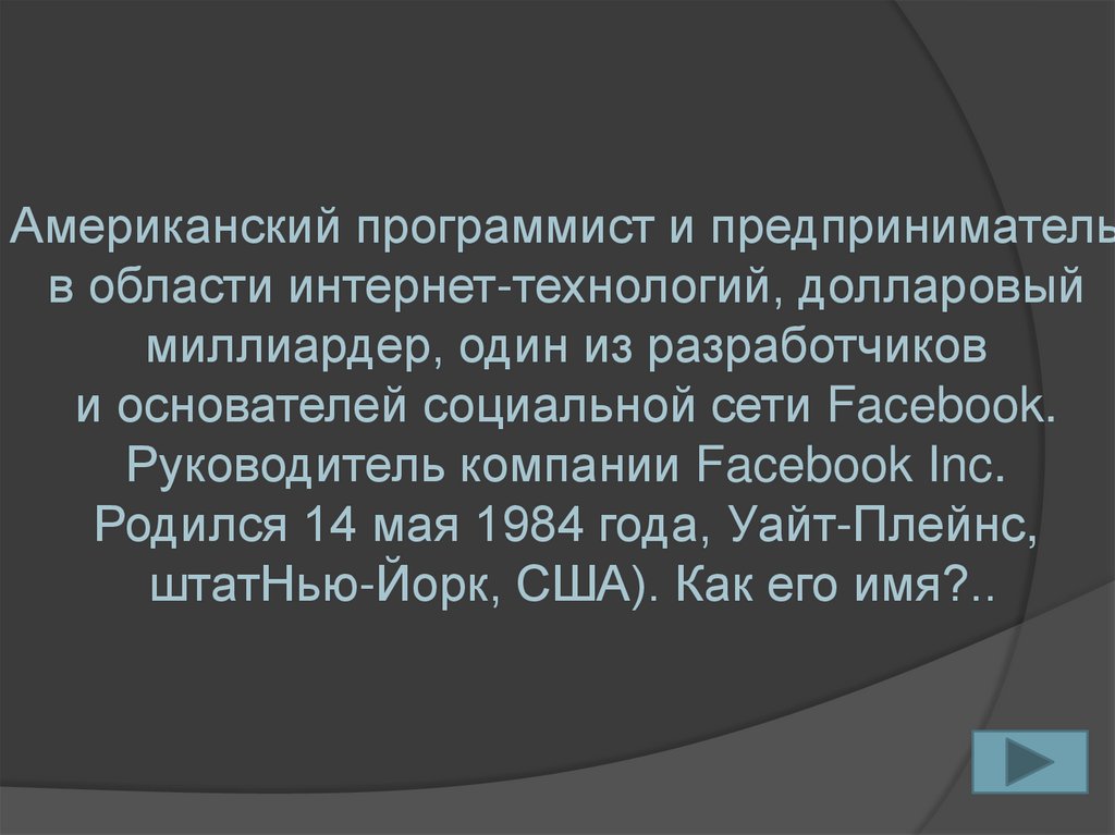 …Марк Э́ллиот Цукербе́рг(англ. Mark Elliot Zuckerberg, [zʌkə'bə:ɡ]
