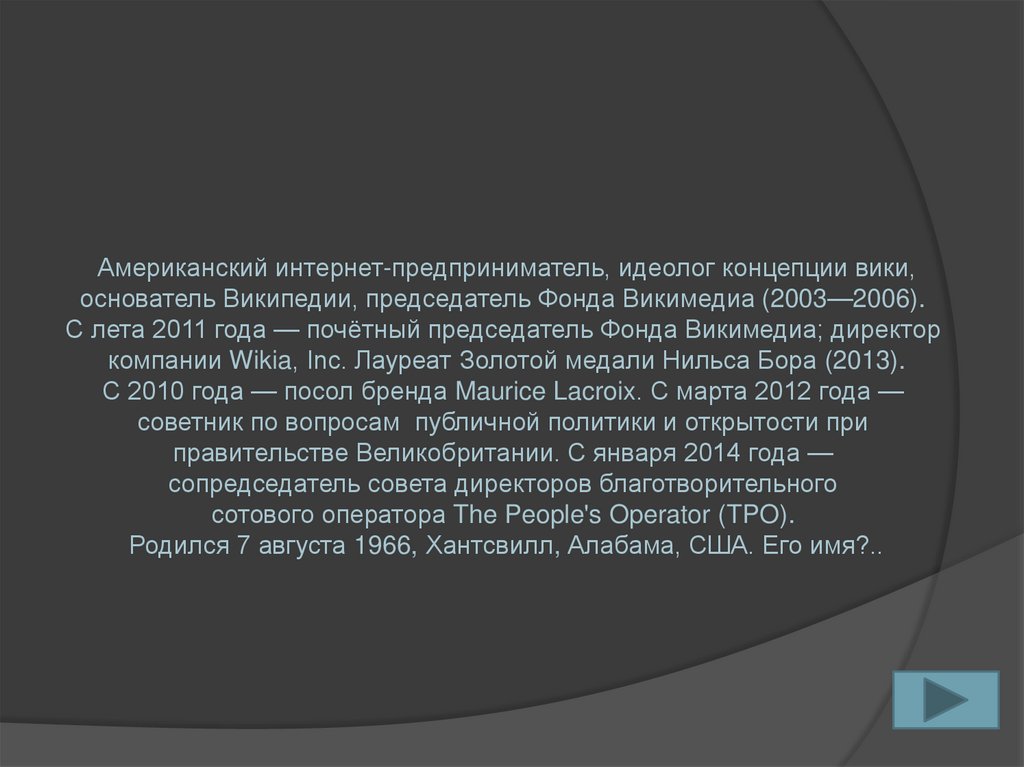 Американский интернет-предприниматель, идеолог концепции вики,основатель Википедии, председатель Фонда Викимедиа (2003—2006).