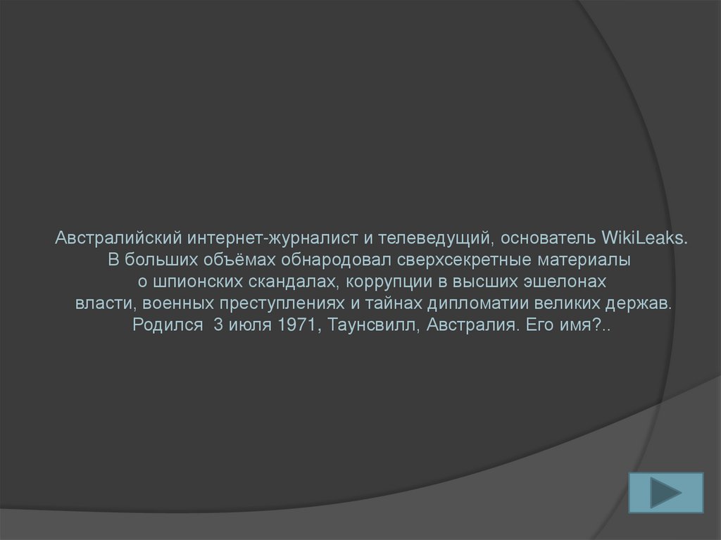 Австралийский интернет-журналист и телеведущий, основатель WikiLeaks.В больших объёмах обнародовал сверхсекретные материалы