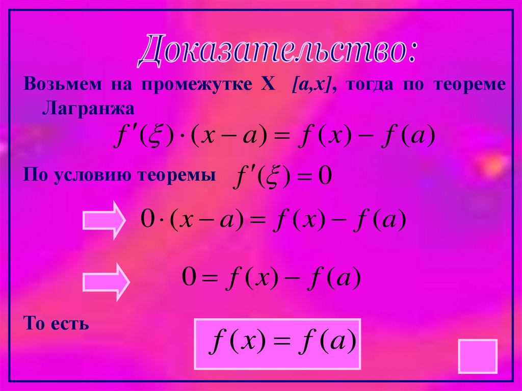 Возьмем на промежутке Х [a,х], тогда по теоремеЛагранжа