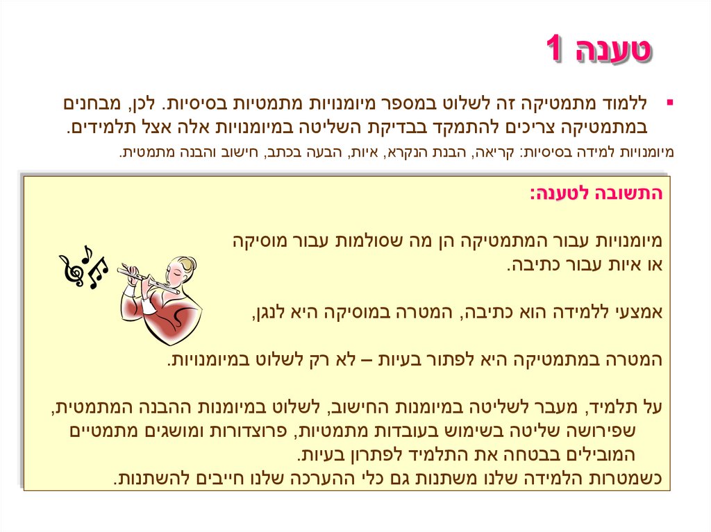טענה 1 ללמוד מתמטיקה זה לשלוט במספר מיומנויות מתמטיות בסיסיות .לכן ,מבחנים