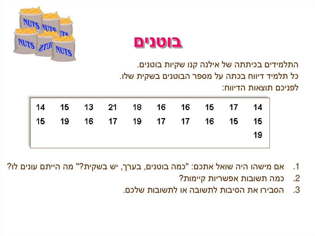 כל תלמיד דיווח בכתה על מספר הבוטנים בשקית שלו.