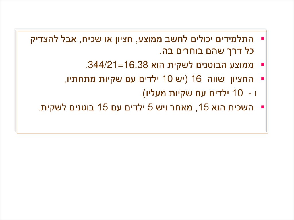 התלמידים יכולים לחשב ממוצע ,חציון או שכיח ,אבל להצדיקכל דרך שהם בוחרים בה.