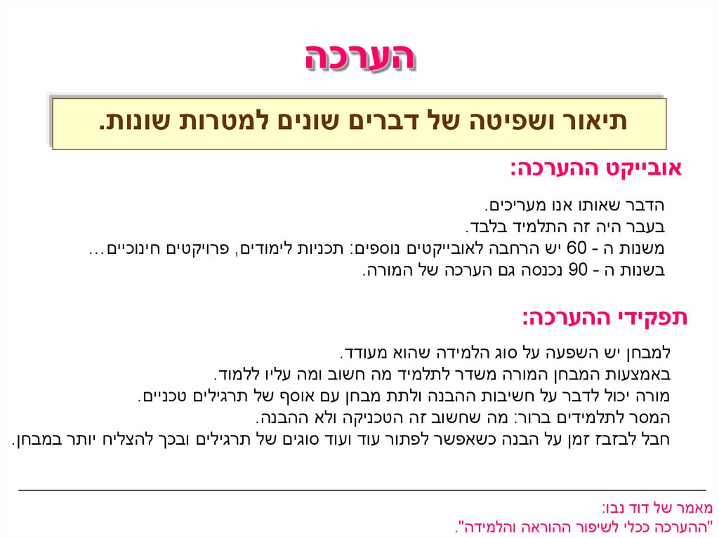 הערכהתיאור ושפיטה של דברים שונים למטרות שונות.