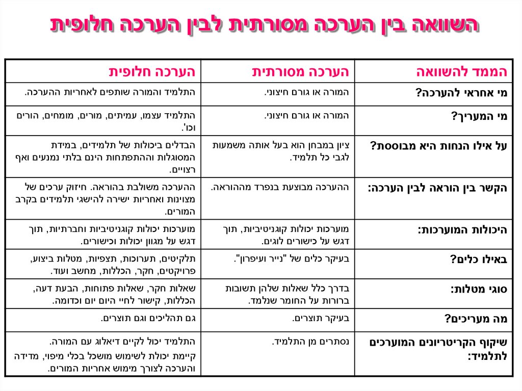 השוואה בין הערכה מסורתית לבין הערכה חלופיתהממד להשוואה