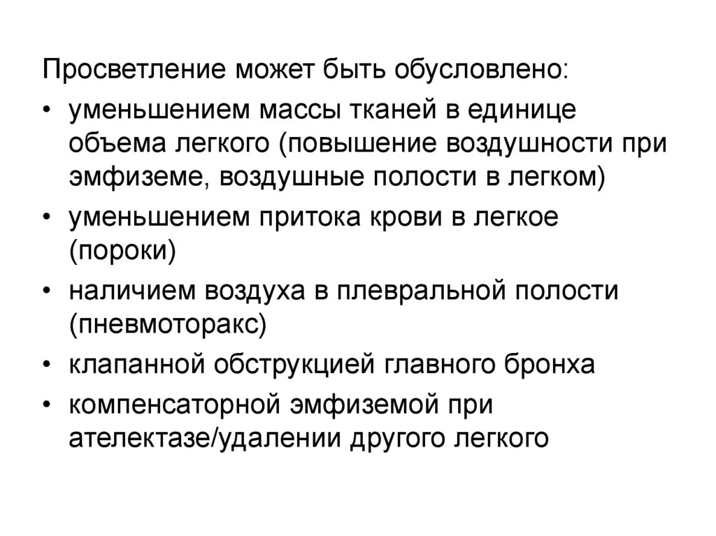 Просветление может быть обусловлено:• уменьшением массы тканей в единице