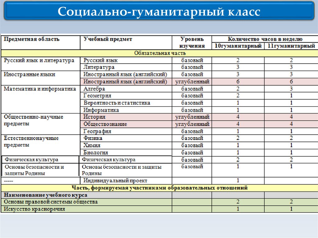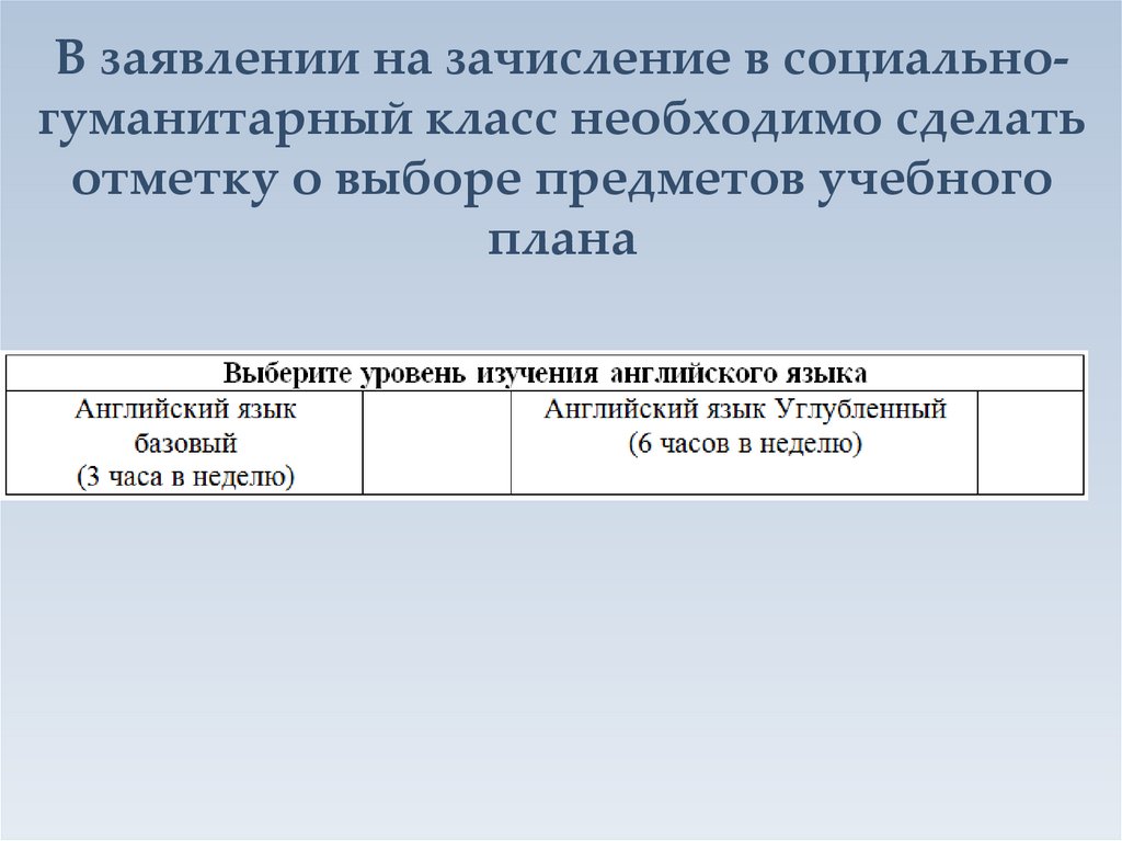 В заявлении на зачисление в социальногуманитарный класс необходимо сделатьотметку о выборе предметов учебного