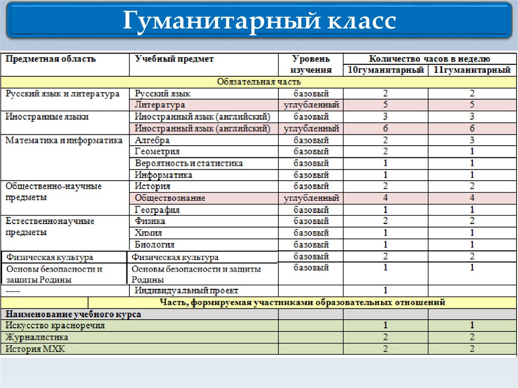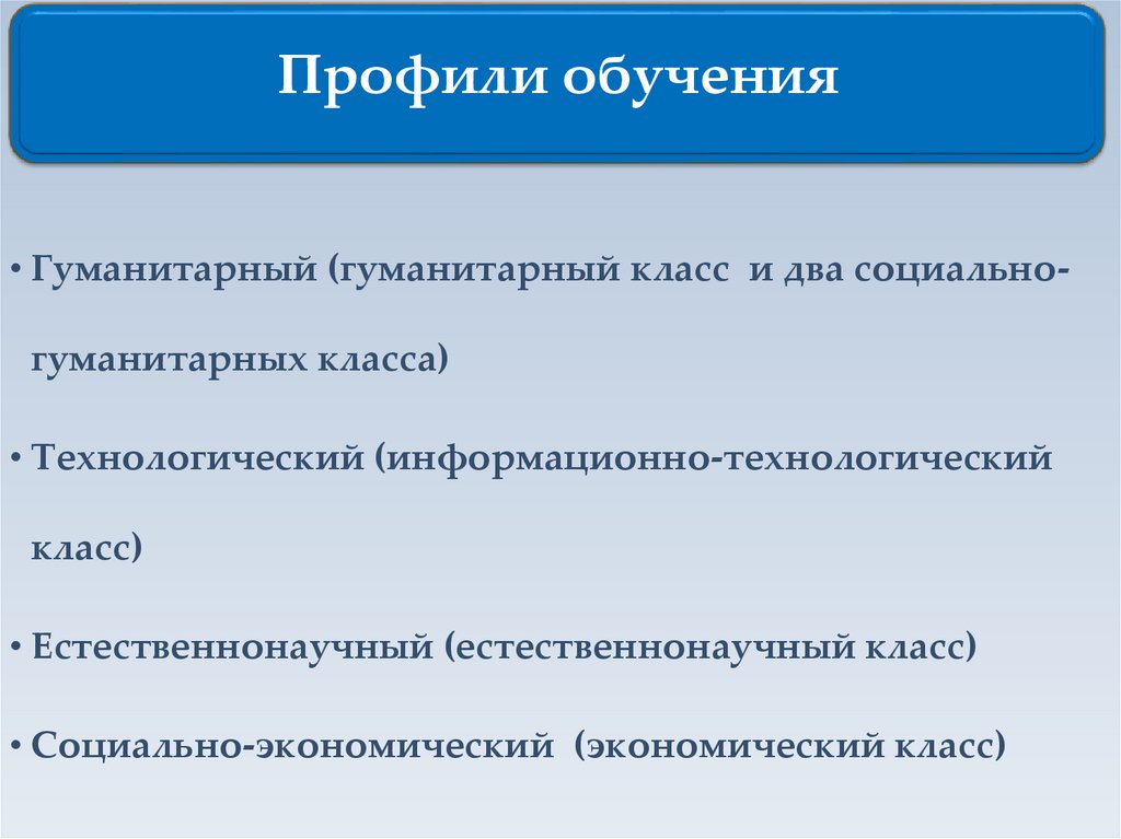 Профили обучения• Гуманитарный (гуманитарный класс и два социально-