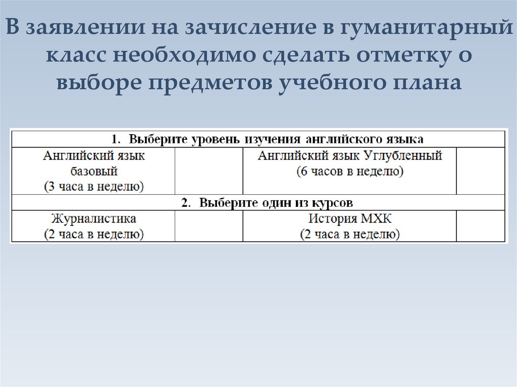 В заявлении на зачисление в гуманитарныйкласс необходимо сделать отметку о