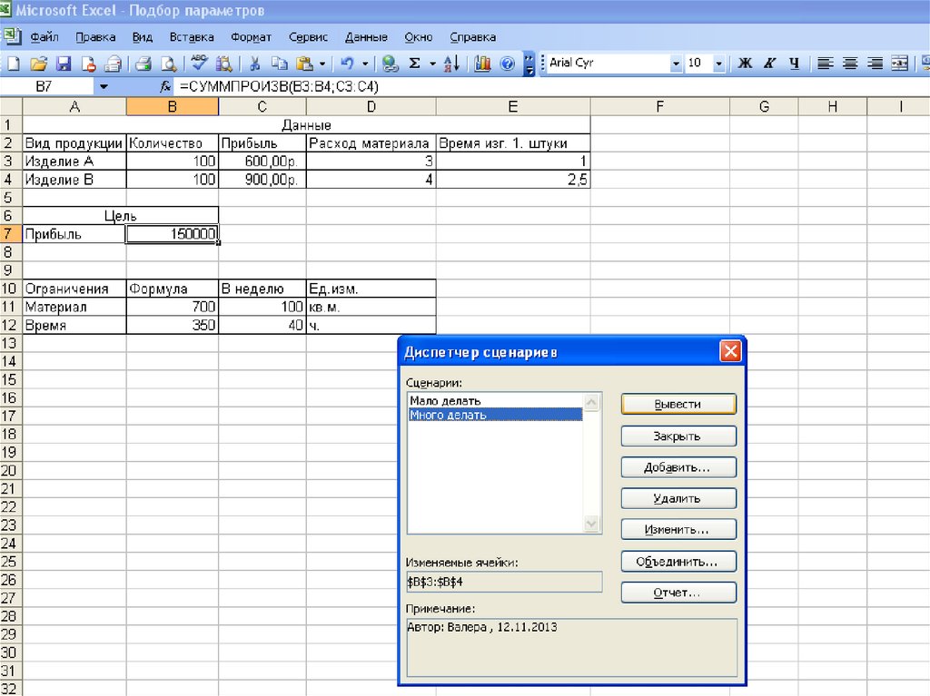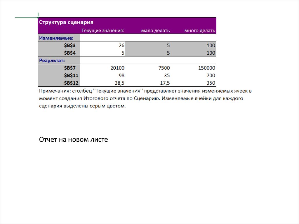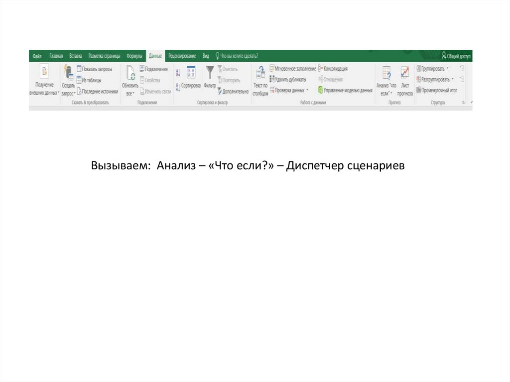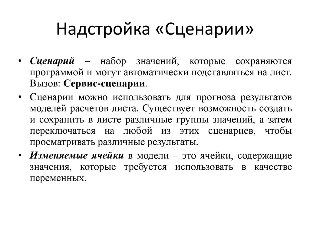 • Сценарий – набор значений, которые сохраняютсяпрограммой и могут автоматически подставляться на лист.