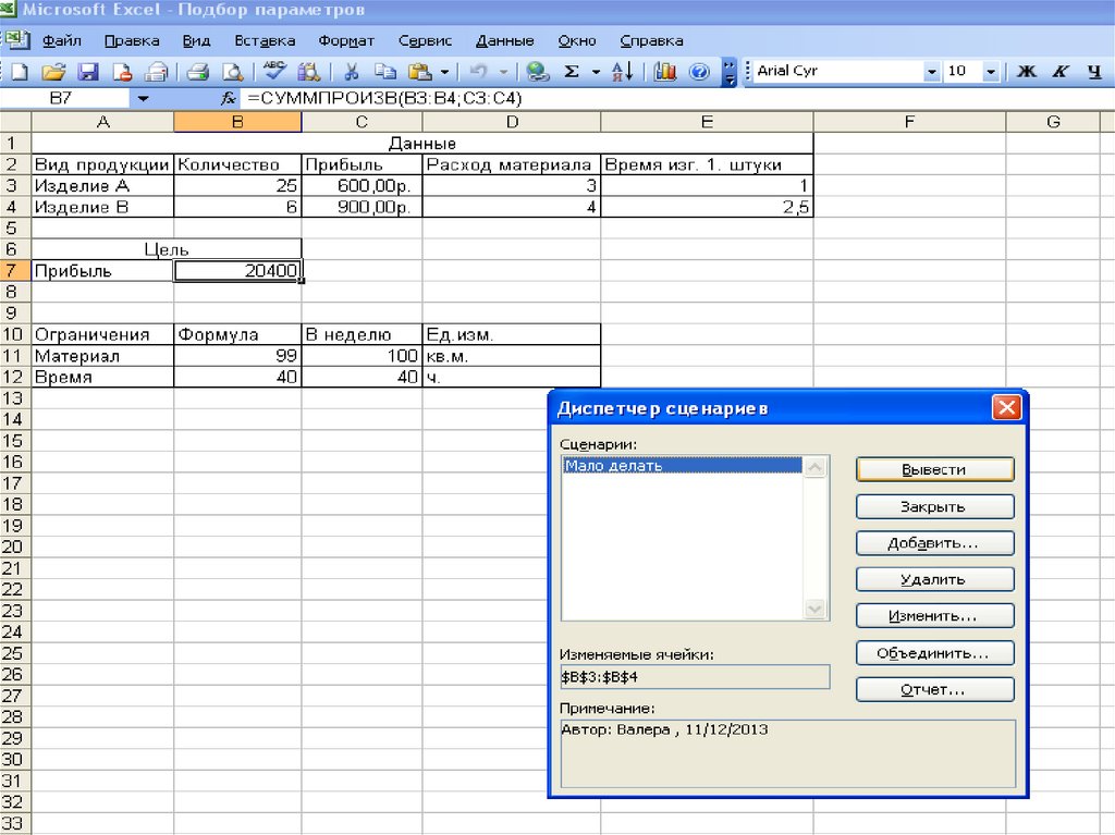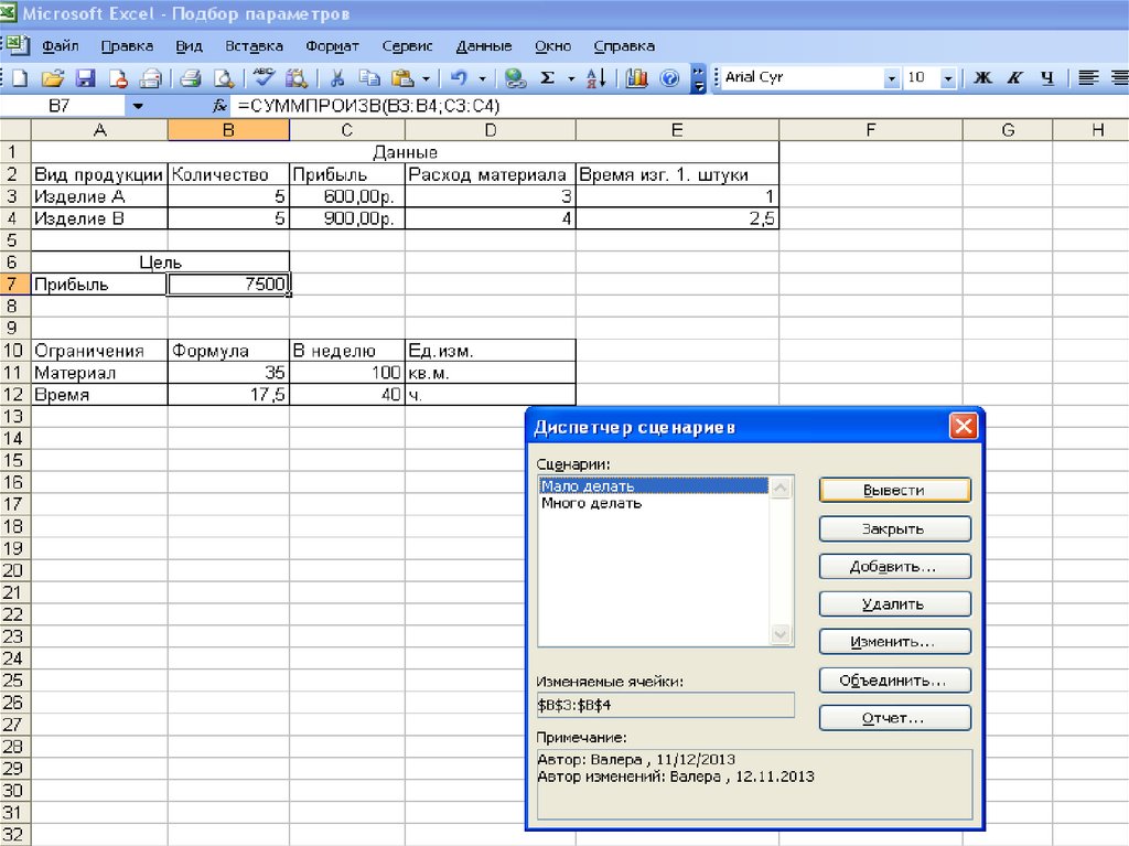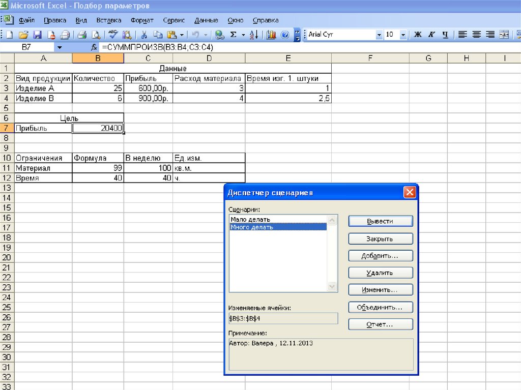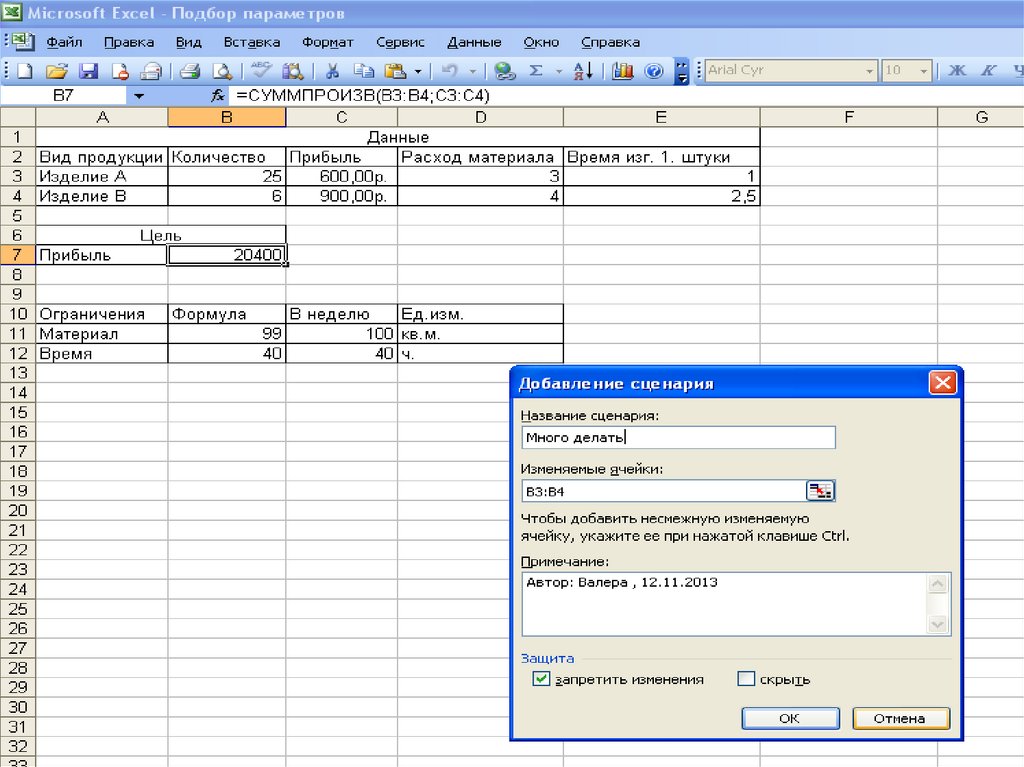 • Сценарий – набор значений, которые сохраняютсяпрограммой и могут автоматически подставляться на лист.