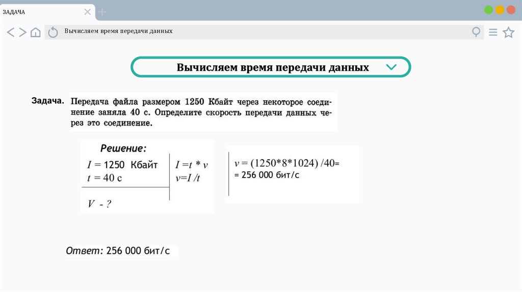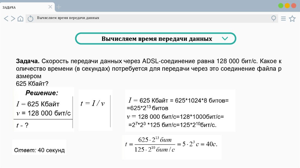 Задача. Скорость передачи данных через ADSL-соединение равна 128 000 бит/c. Какое к