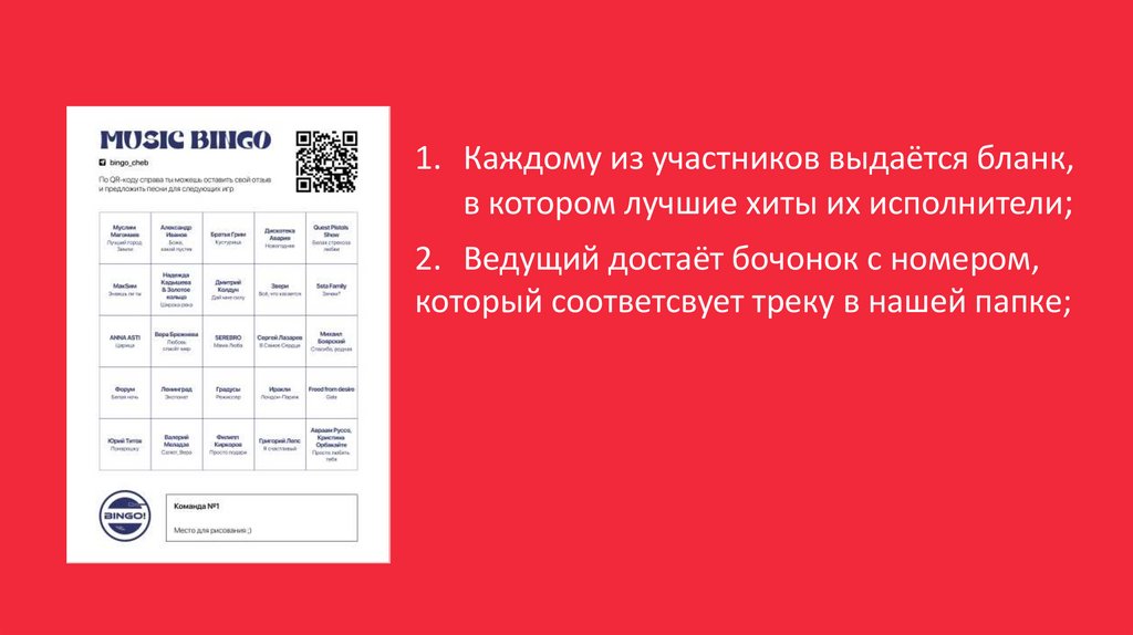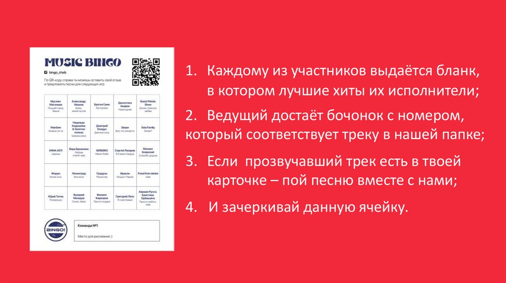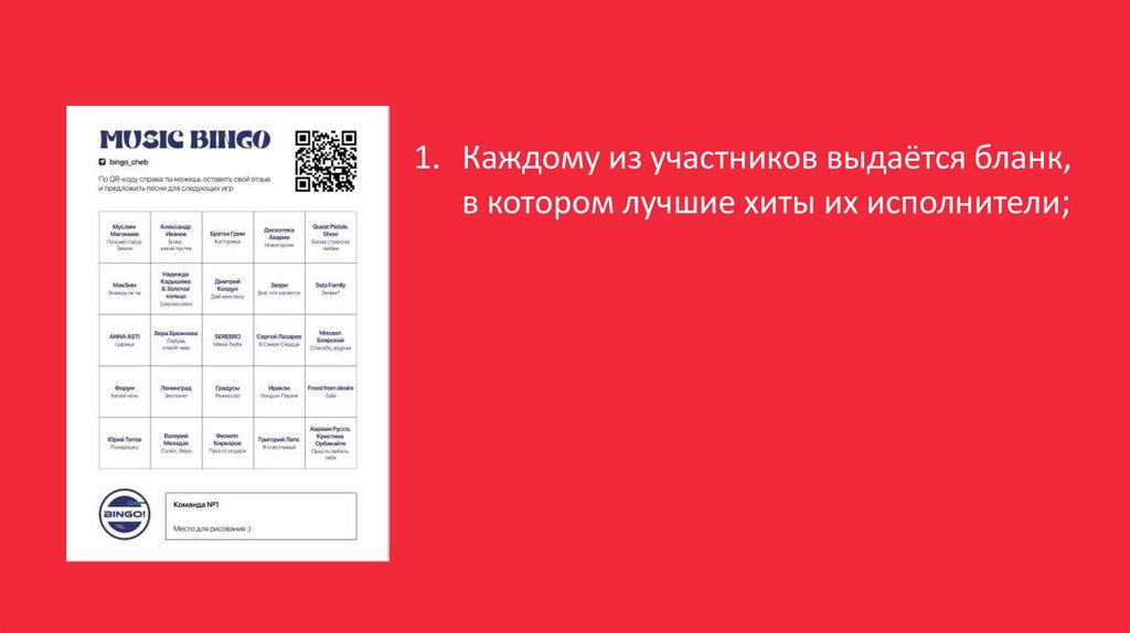 1. Каждому из участников выдаётся бланк,в котором лучшие хиты их исполнители;