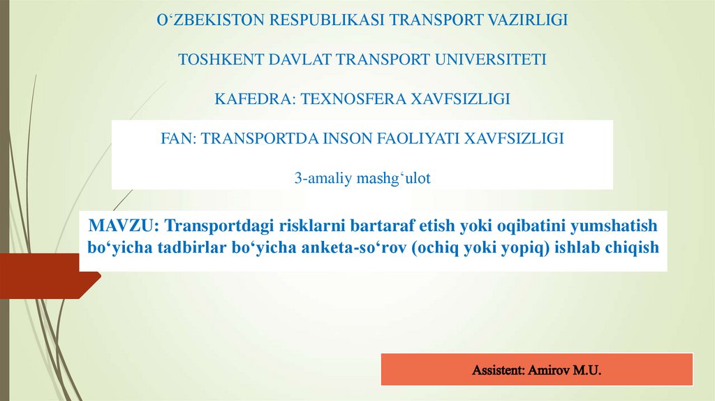 1. O‘ZBEKISTON RESPUBLIKASI TRANSPORT VAZIRLIGI TOSHKENT DAVLAT TRANSPORT UNIVERSITETI KAFEDRA: TEXNOSFERA XAVFSIZLIGI FAN:
