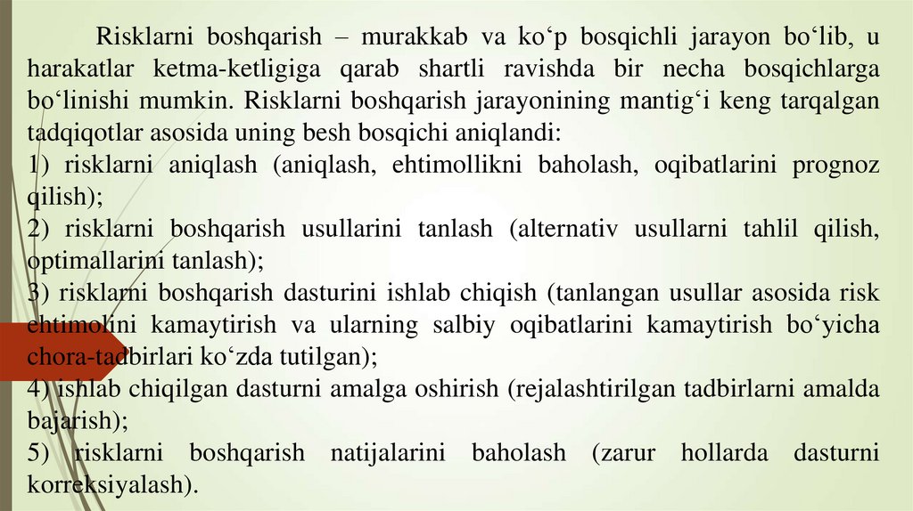 Risklarni boshqarish – murakkab va ko‘p bosqichli jarayon bo‘lib, uharakatlar ketma-ketligiga qarab shartli ravishda bir necha bosqichlarga