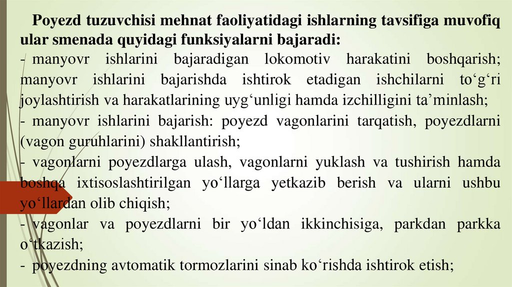 Poyezd tuzuvchisi mehnat faoliyatidagi ishlarning tavsifiga muvofiqular smenada quyidagi funksiyalarni bajaradi: