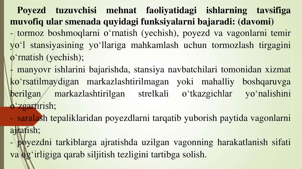 Poyezd tuzuvchisi mehnat faoliyatidagi ishlarning tavsifigamuvofiq ular smenada quyidagi funksiyalarni bajaradi: (davomi)