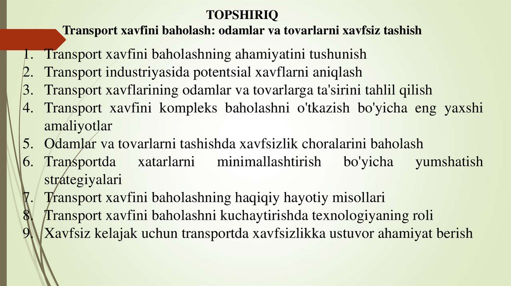 TOPSHIRIQTransport xavfini baholash: odamlar va tovarlarni xavfsiz tashish