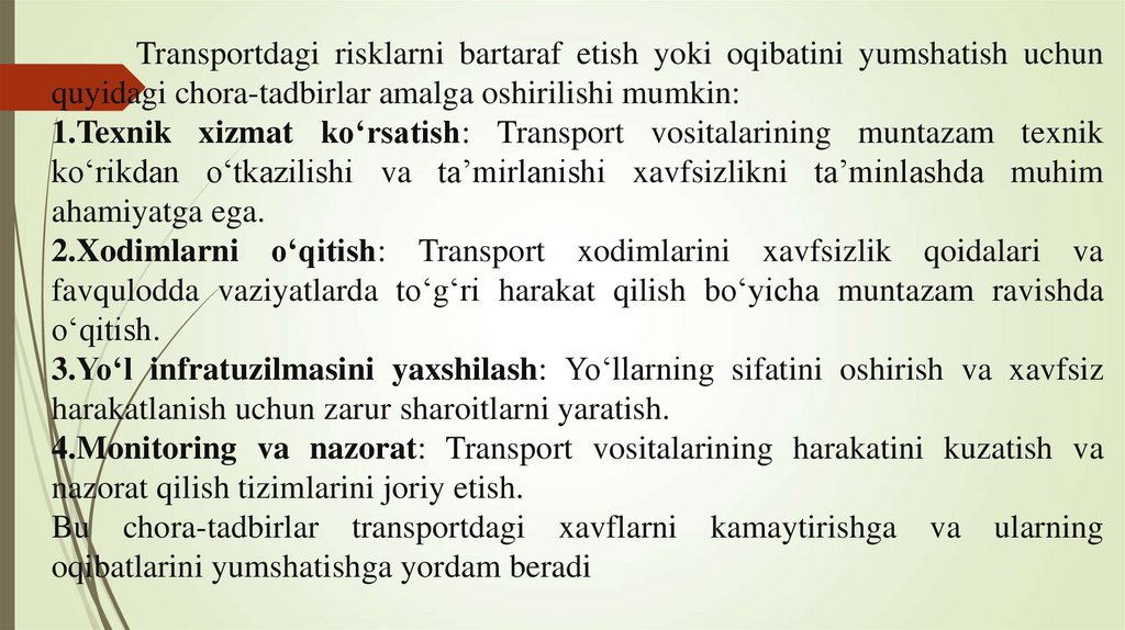Bu chora-tadbirlar transportdagi xavflarni kamaytirishga va ularning