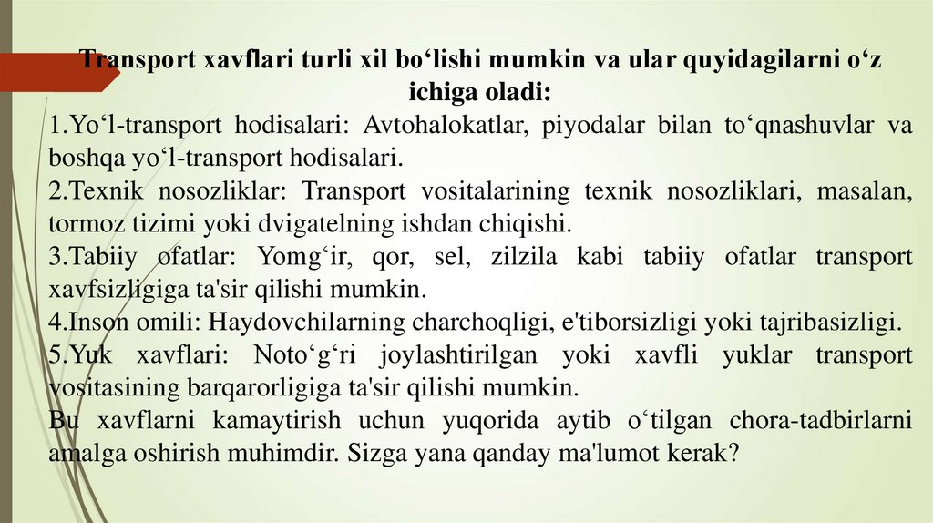 Transport xavflari turli xil bo‘lishi mumkin va ular quyidagilarni o‘zichiga oladi: