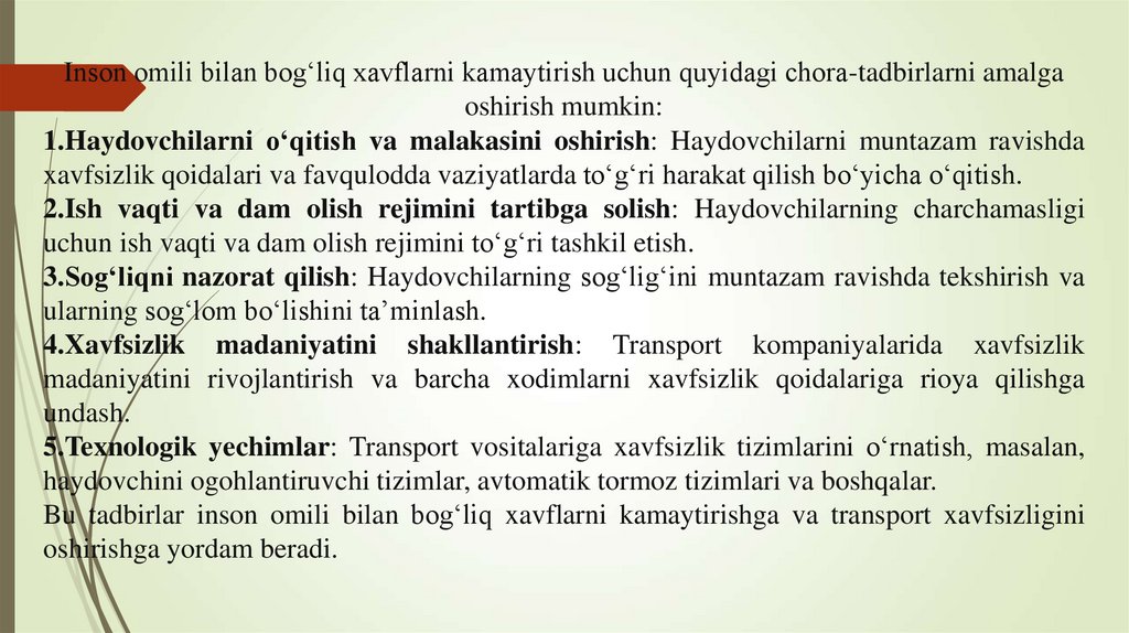 Bu tadbirlar inson omili bilan bog‘liq xavflarni kamaytirishga va transport xavfsizligini