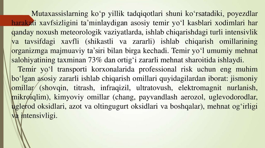 organizmga majmuaviy ta’siri bilan birga kechadi. Temir yoʻl umumiy mehnat