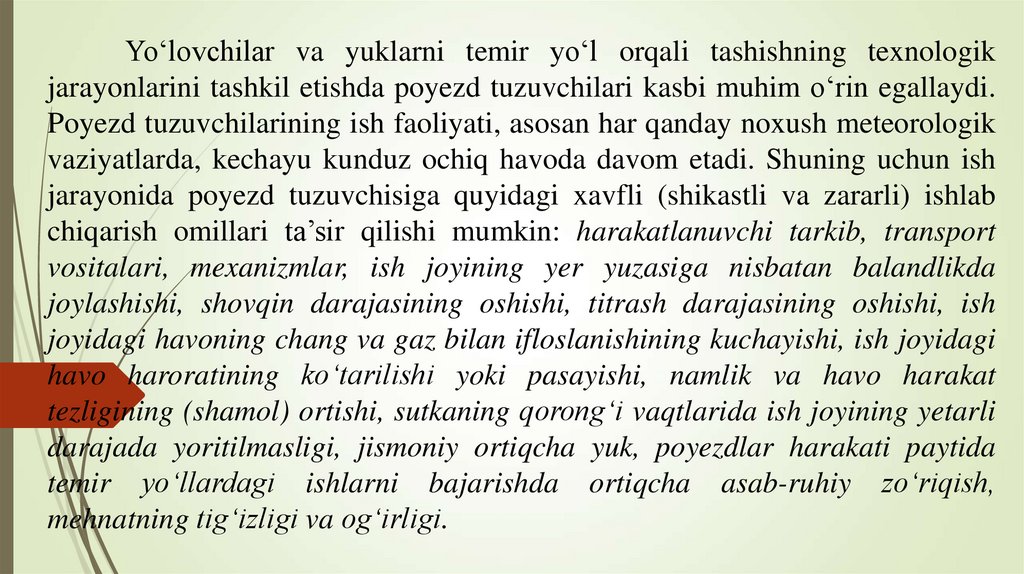 jarayonida poyezd tuzuvchisiga quyidagi xavfli (shikastli va zararli) ishlab
