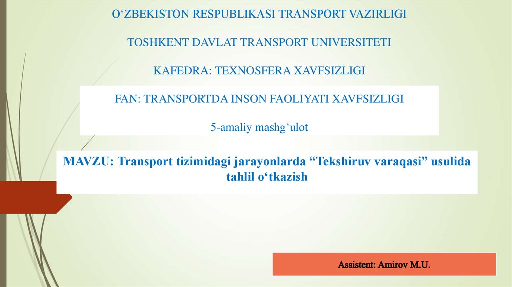 1. O‘ZBEKISTON RESPUBLIKASI TRANSPORT VAZIRLIGI TOSHKENT DAVLAT TRANSPORT UNIVERSITETI KAFEDRA: TEXNOSFERA XAVFSIZLIGI FAN: