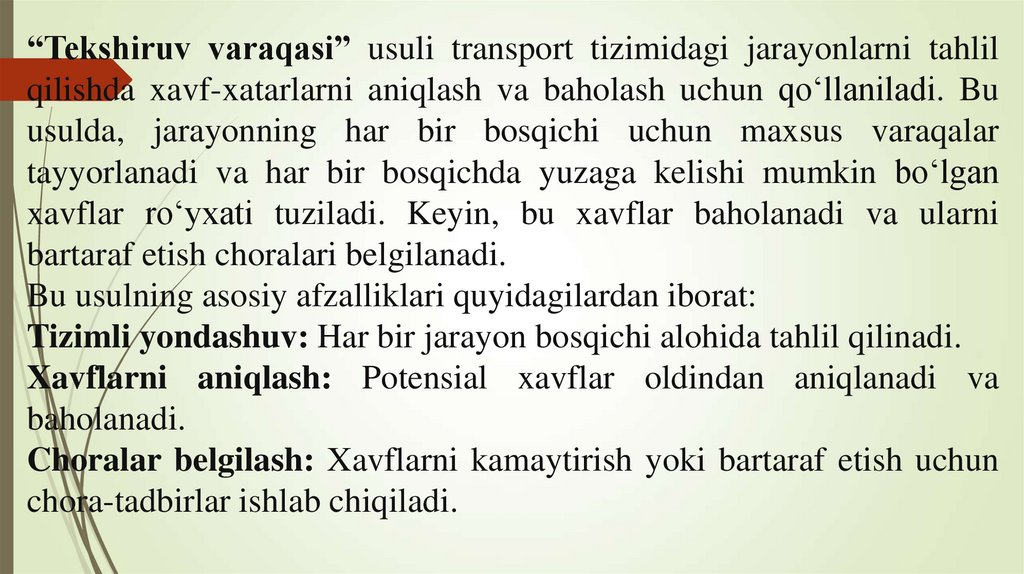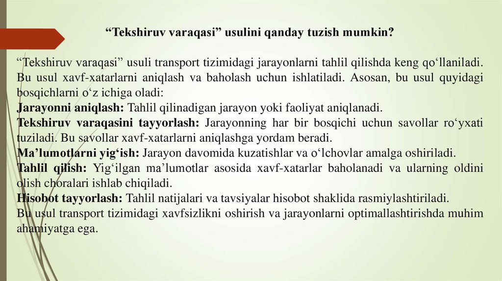 “Tekshiruv varaqasi” usuli transport tizimidagi jarayonlarni tahlilqilishda xavf-xatarlarni aniqlash va baholash uchun qo‘llaniladi. Bu