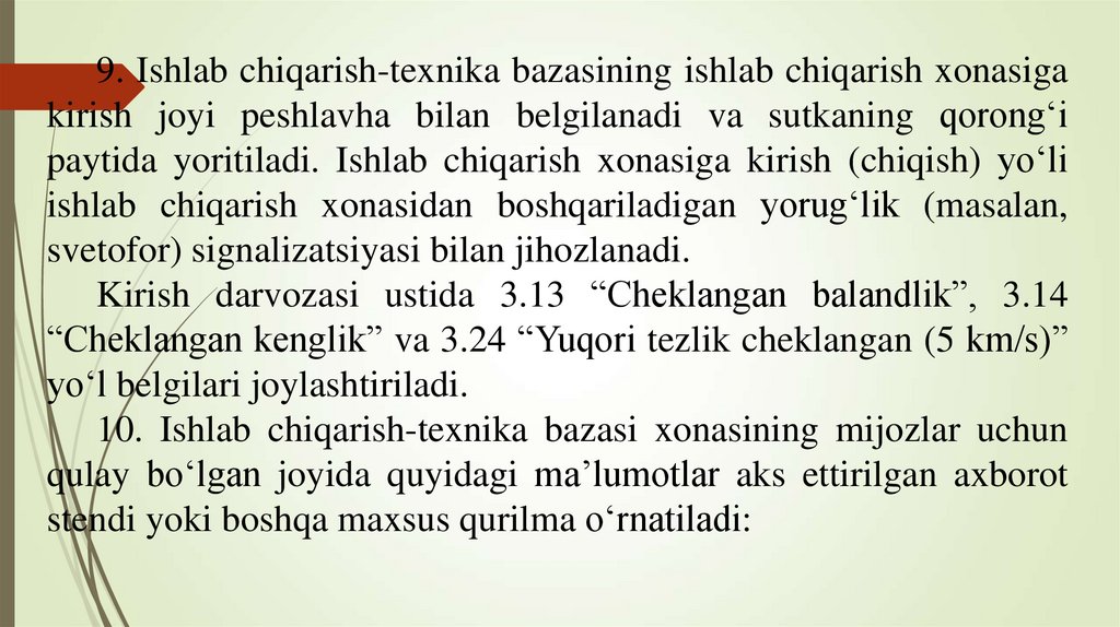 9. Ishlab chiqarish-texnika bazasining ishlab chiqarish xonasigakirish joyi peshlavha bilan belgilanadi va sutkaning qorong‘i