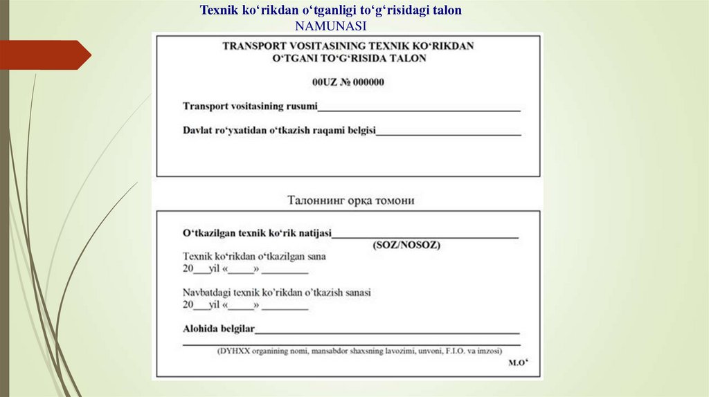 Texnik ko‘rikdan o‘tganligi to‘g‘risidagi talonNAMUNASI