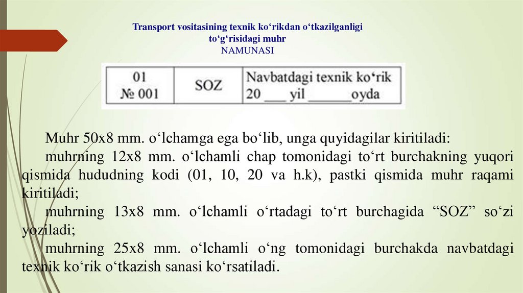 Transport vositasining texnik ko‘rikdan o‘tkazilganligito‘g‘risidagi muhr