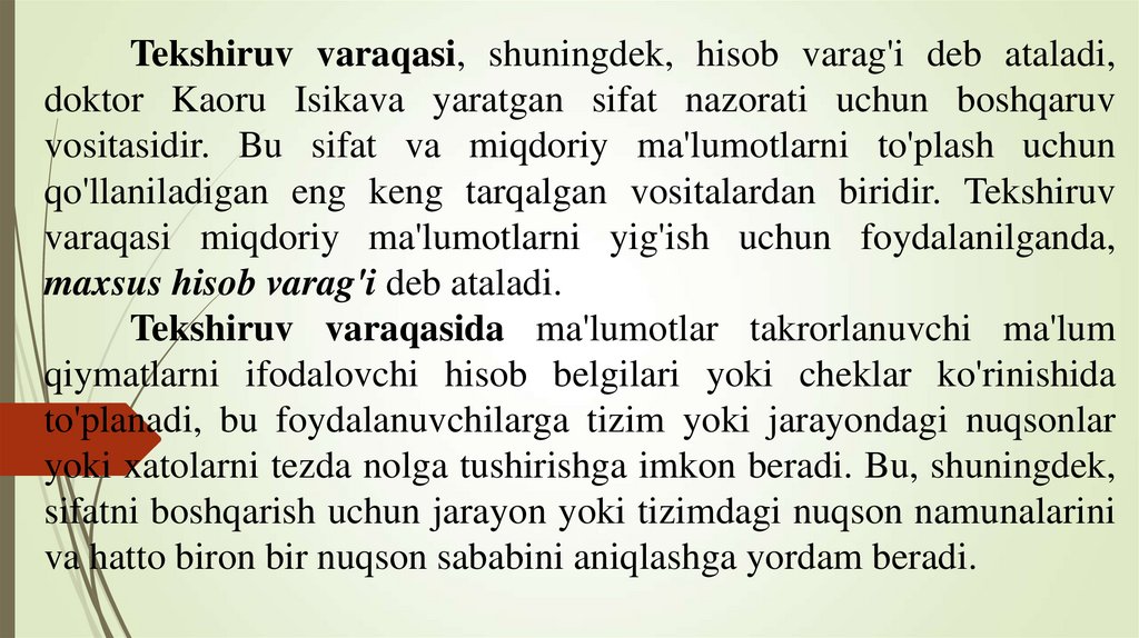 Tekshiruv varaqasi, shuningdek, hisob varag'i deb ataladi,doktor Kaoru Isikava yaratgan sifat nazorati uchun boshqaruv