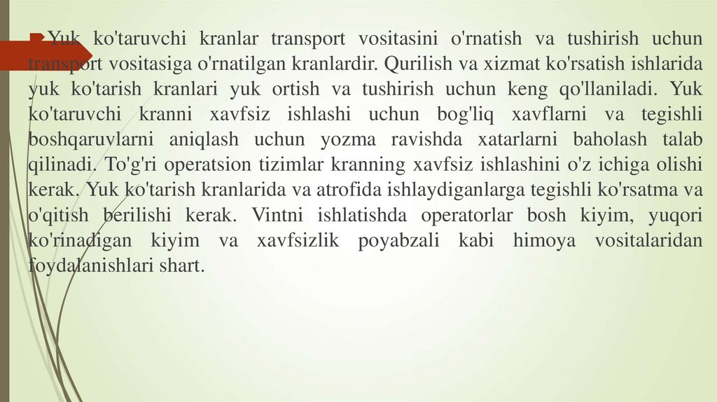 kerak. Yuk ko'tarish kranlarida va atrofida ishlaydiganlarga tegishli ko'rsatma va