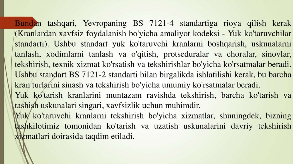 standarti). Ushbu standart yuk ko'taruvchi kranlarni boshqarish, uskunalarni