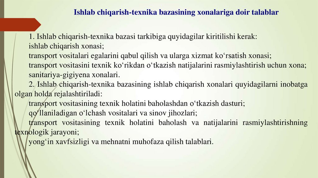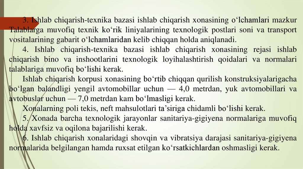 3. Ishlab chiqarish-texnika bazasi ishlab chiqarish xonasining o‘lchamlari mazkurTalablarga muvofiq texnik ko‘rik liniyalarining texnologik postlari soni va transport