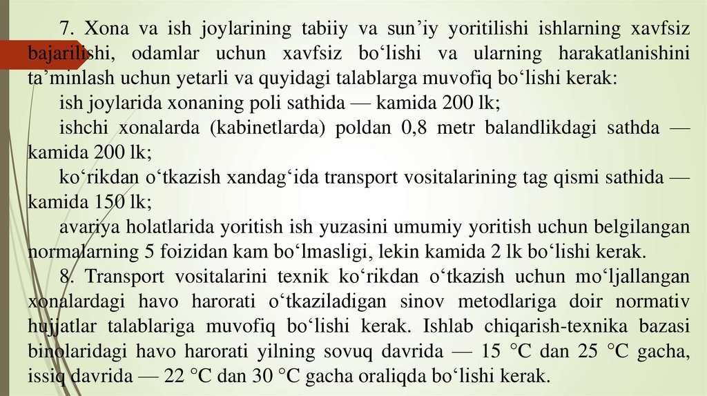 7. Xona va ish joylarining tabiiy va sun’iy yoritilishi ishlarning xavfsizbajarilishi, odamlar uchun xavfsiz bo‘lishi va ularning harakatlanishini
