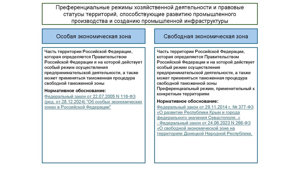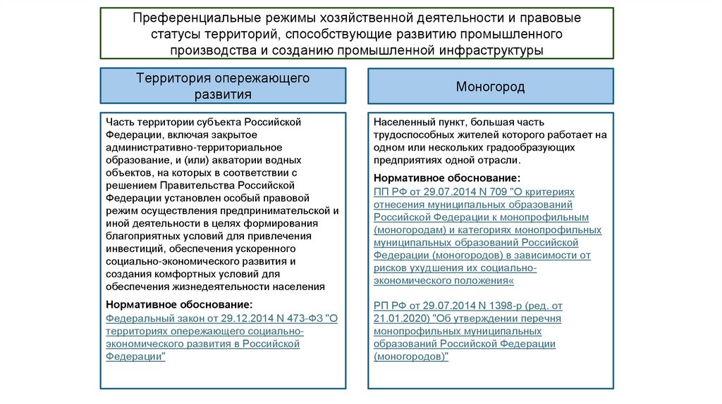 Преференциальные режимы хозяйственной деятельности и правовыестатусы территорий, способствующие развитию промышленного