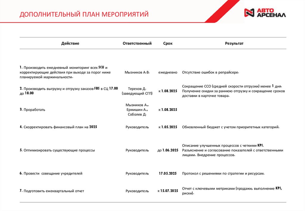 ДОПОЛНИТЕЛЬНЫЙ ПЛАН МЕРОПРИЯТИЙДействие